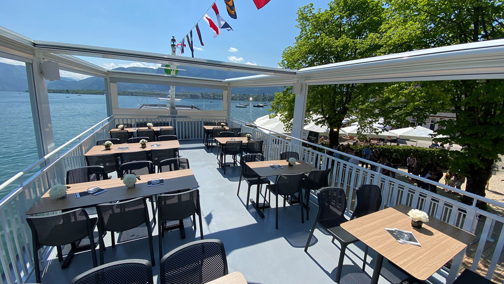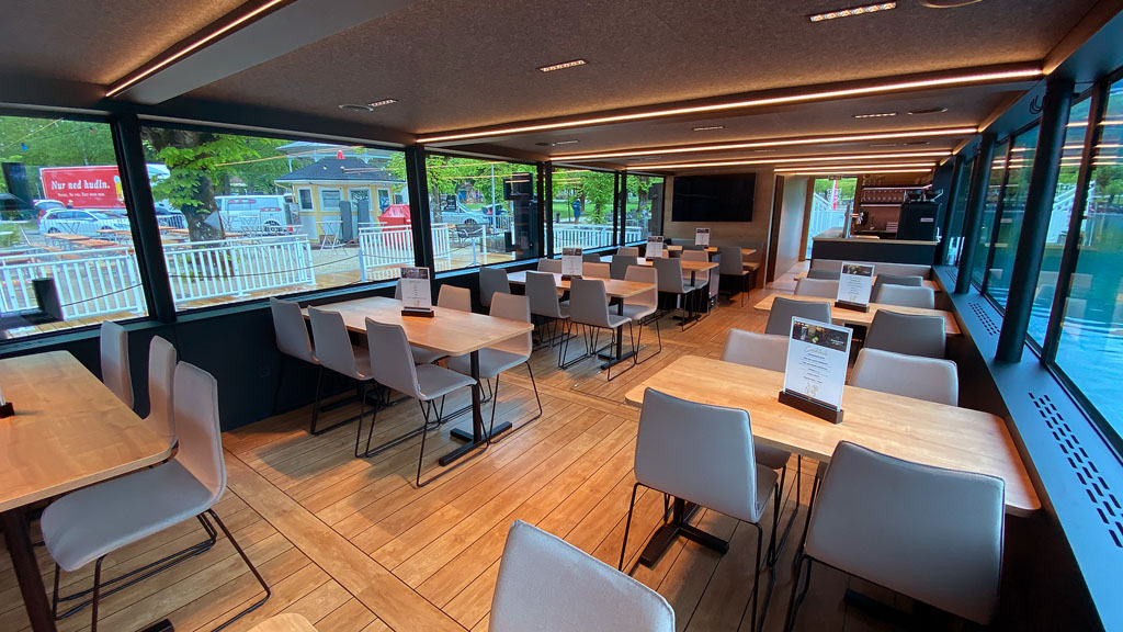 Modernste Soundtechnik steht bereit. Die brandneue Schiffsbar, 150 gemütliche Plätze (100 witterungsgeschützt und davon 50 in der komfortablen Kabine) und die Crew freuen sich auf Sie. Ideal auch für Gruppen und Busreisen. Das Plätschern der Wellen gehört dann nur Ihnen und Ihren Gästen.
